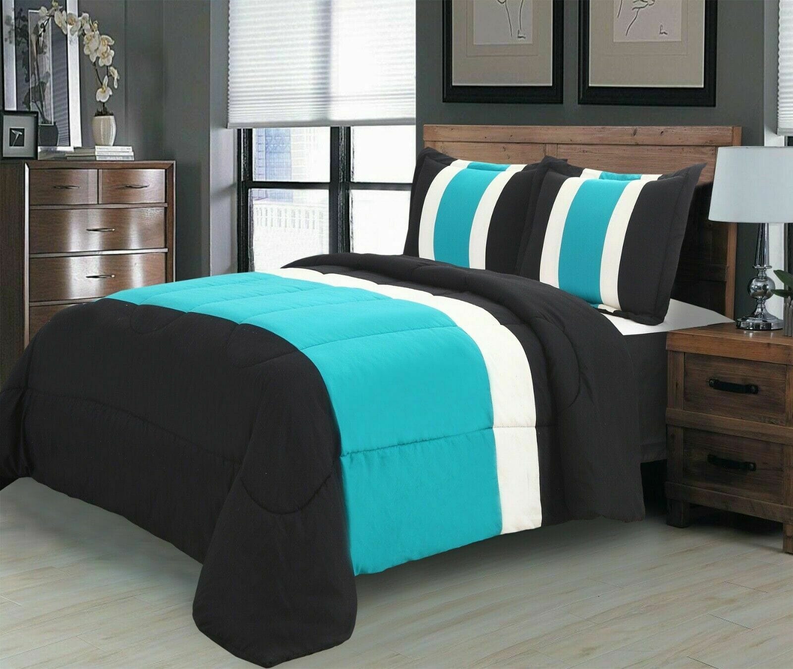 This high value set Includes a bed skirt, matching pillow shams, and a 4-piece sheet set Full/Queen Comforter 90″X90″ King/Cal king Comforter 104″X90″