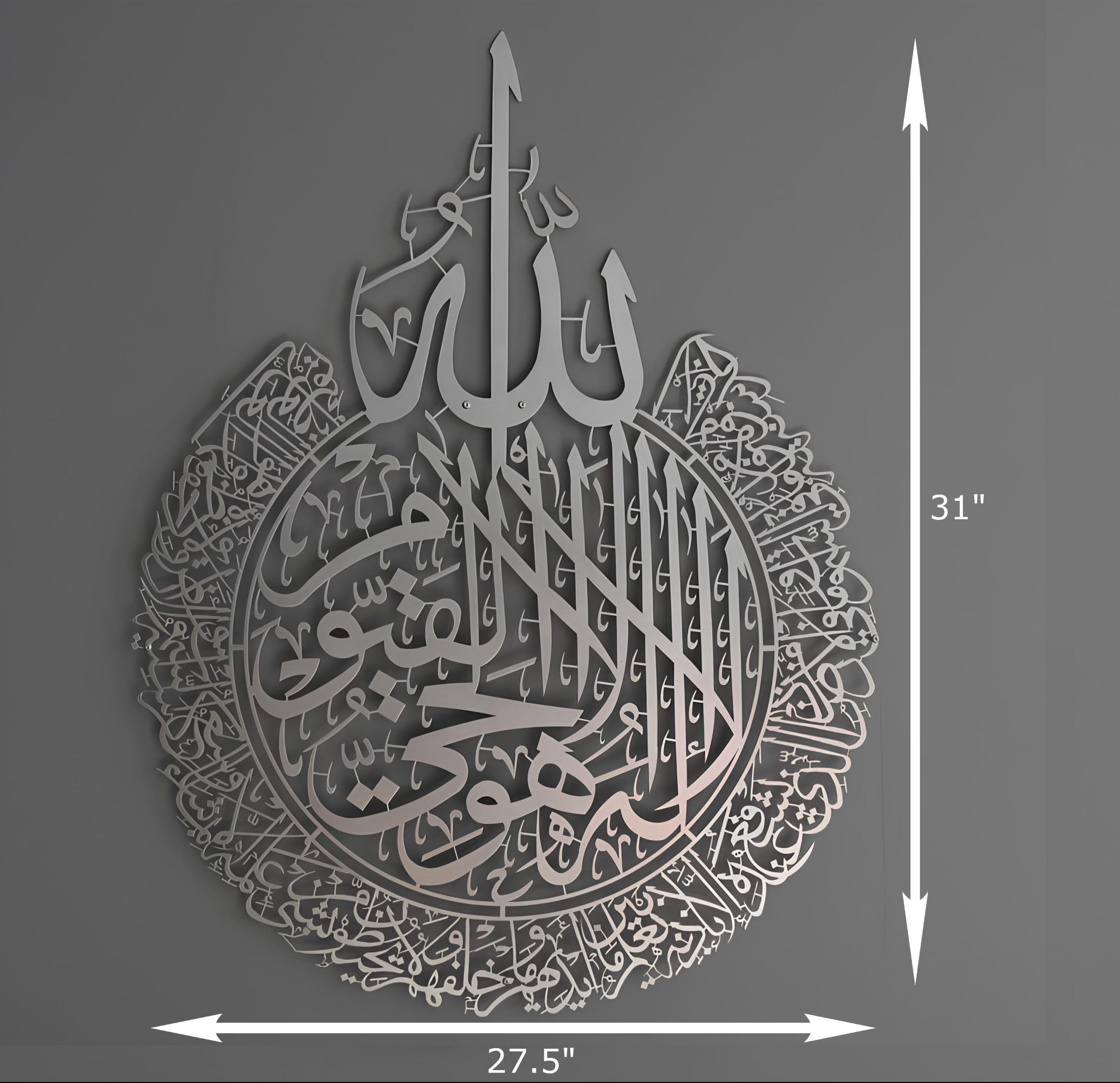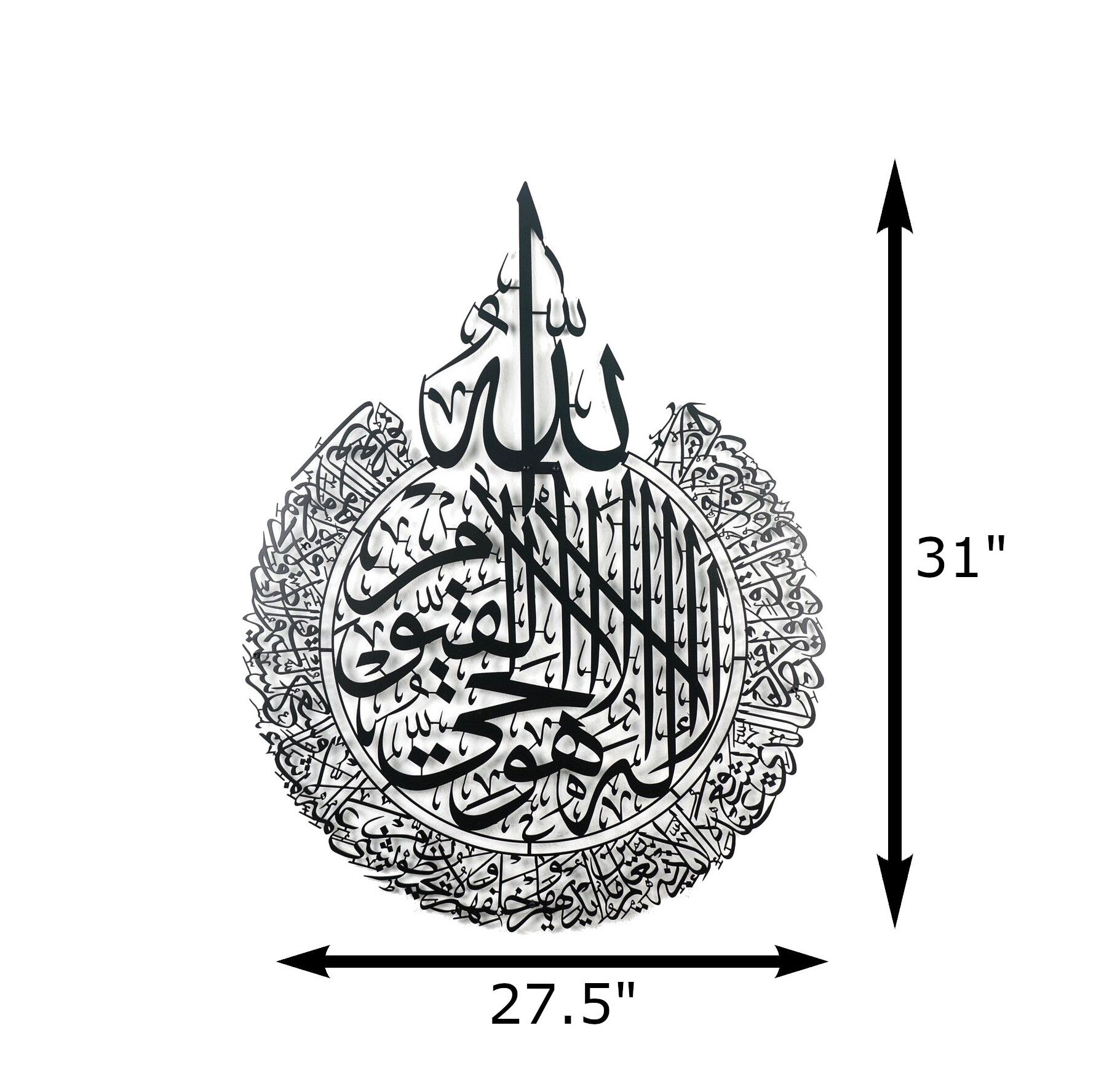 | The art features beautiful Arabic caligraphy of the throne verse from the Holy Quran. One of the most powerful verses describing the power of God. Allow this beautiful metal islamic wall art to adorn your walls to remind you of your Creator. The Wall Art is made of Metal which is easy to clean and maintain. The metal material means that you do not have to worry about it breaking either. With this Quranic Art, you get quality and elengance! Our standard Metal frame is the same price as the small frames from most other sellers. We have the best price for our pieces. Our pieces are 31″ L x 27.5″ W! We also offer them in 3 different colors: Black, Gold and Silver. The piece is also easy to set up and easy to clean! |