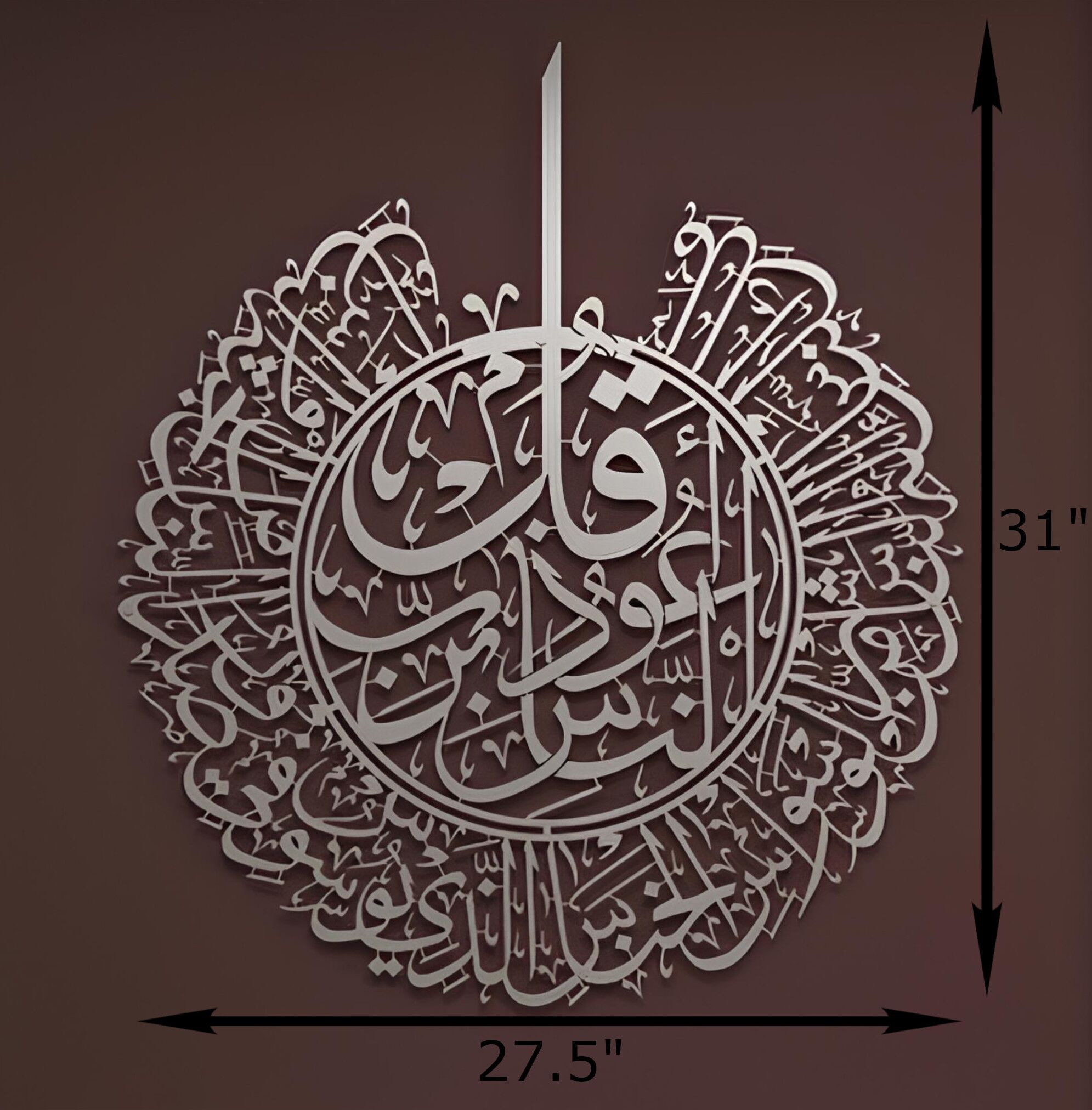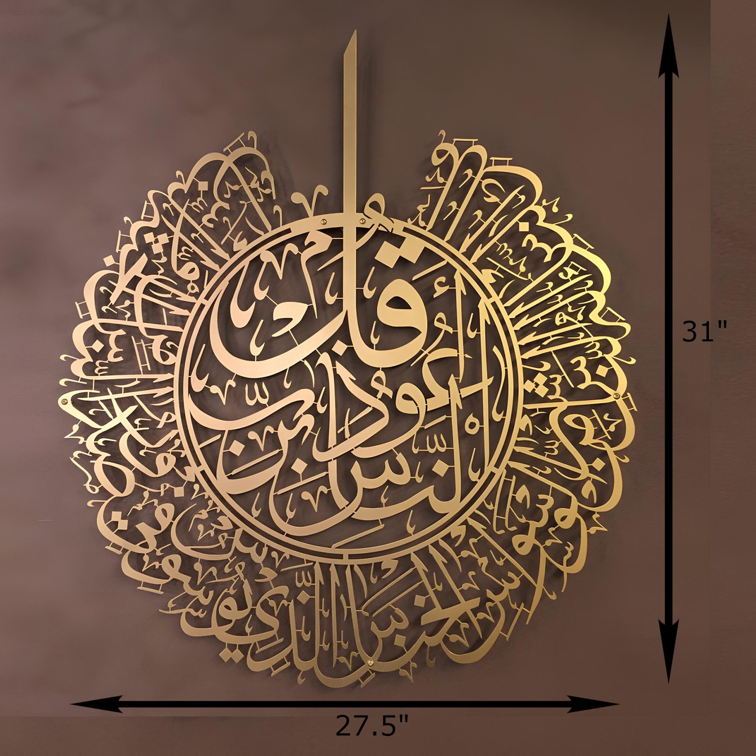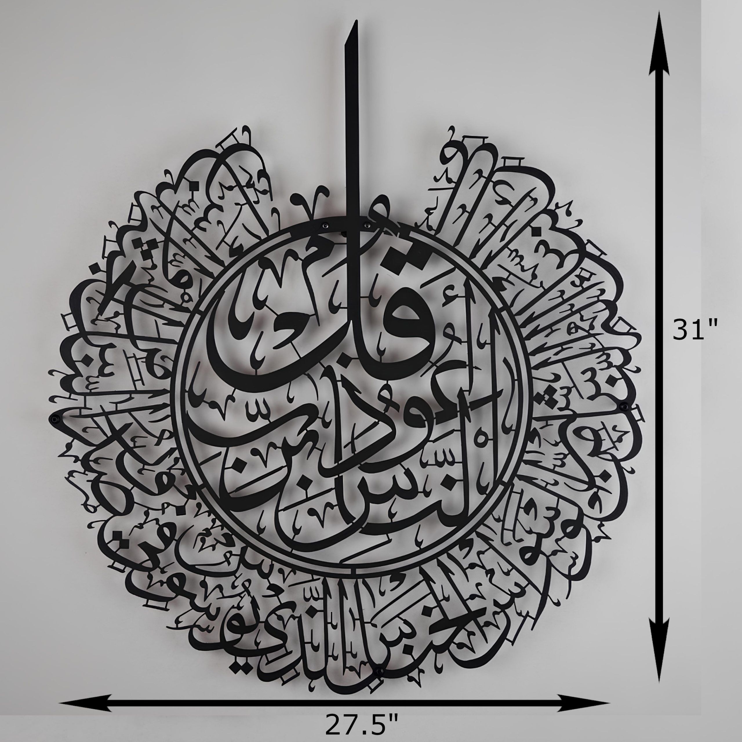 | This wall sculpture features the beautiful and powerful Surah Al-Nas in metal and beautiful Arabic calligraphy. The metal material means that you do not have to worry about it breaking either. Our standard Metal frame is the same price as the small frames from most other sellers. We have the best price for our pieces. Our pieces are 31″ L x 27.5″ W! We also offer them in 3 different colors: Black, Gold and Silver. Get our Islamic Wall art for your home today! |