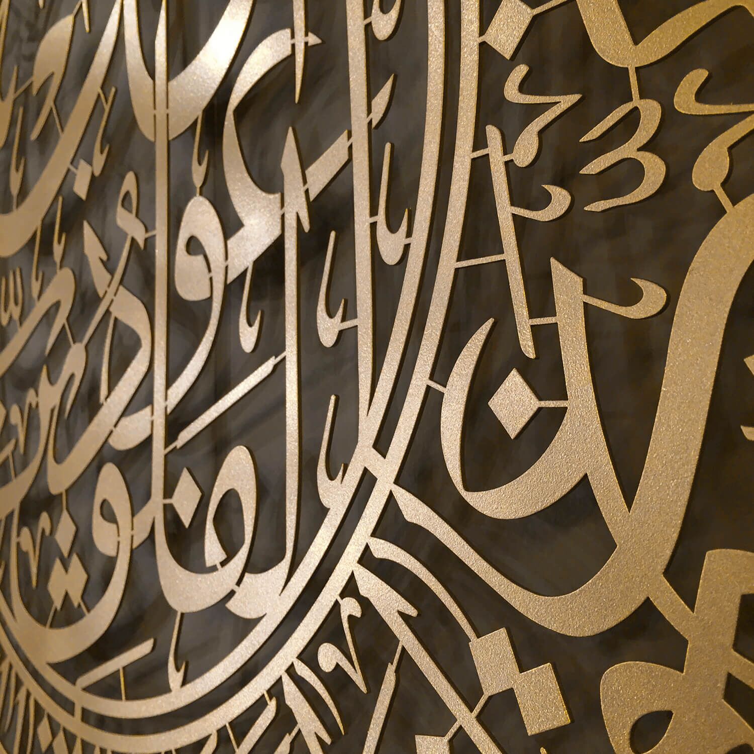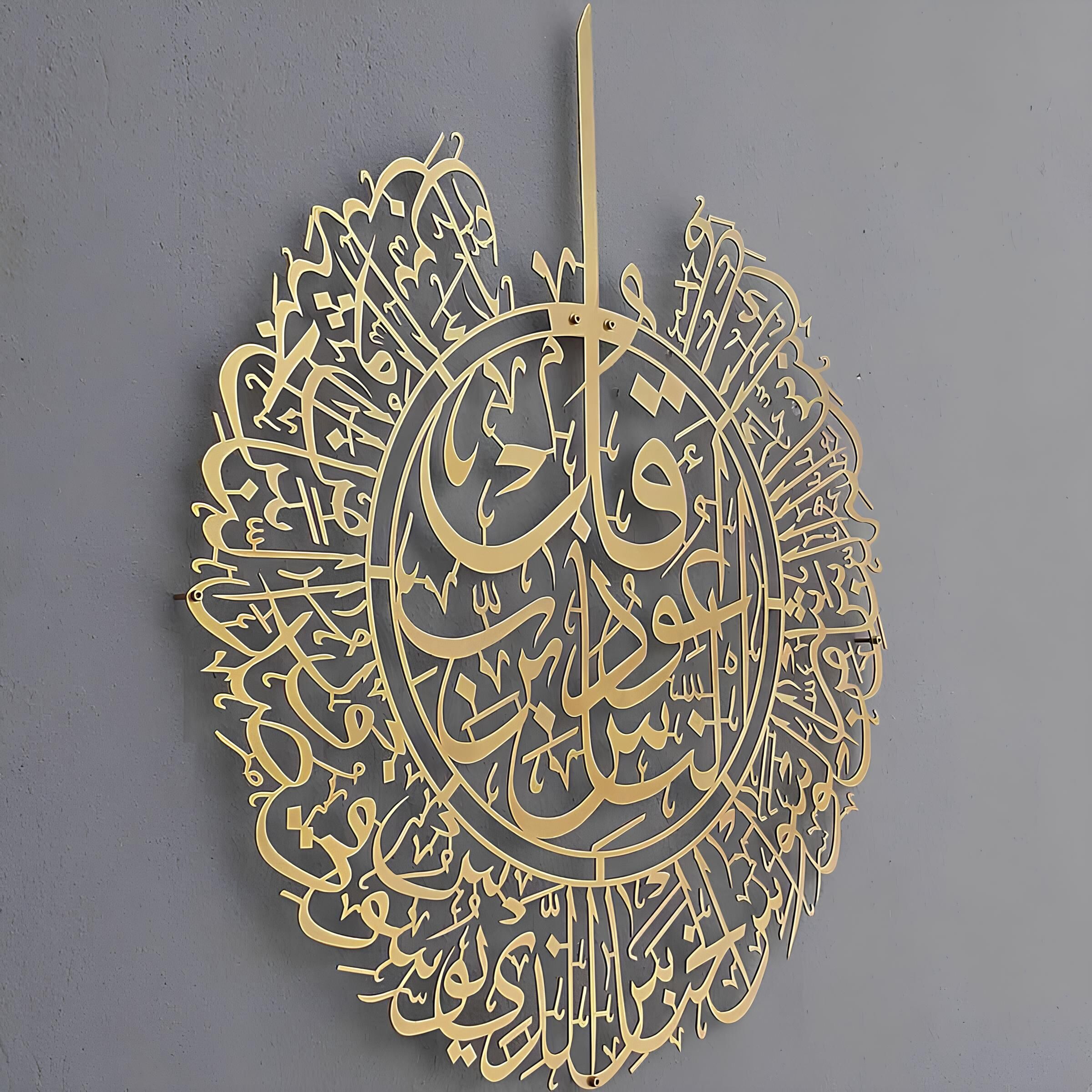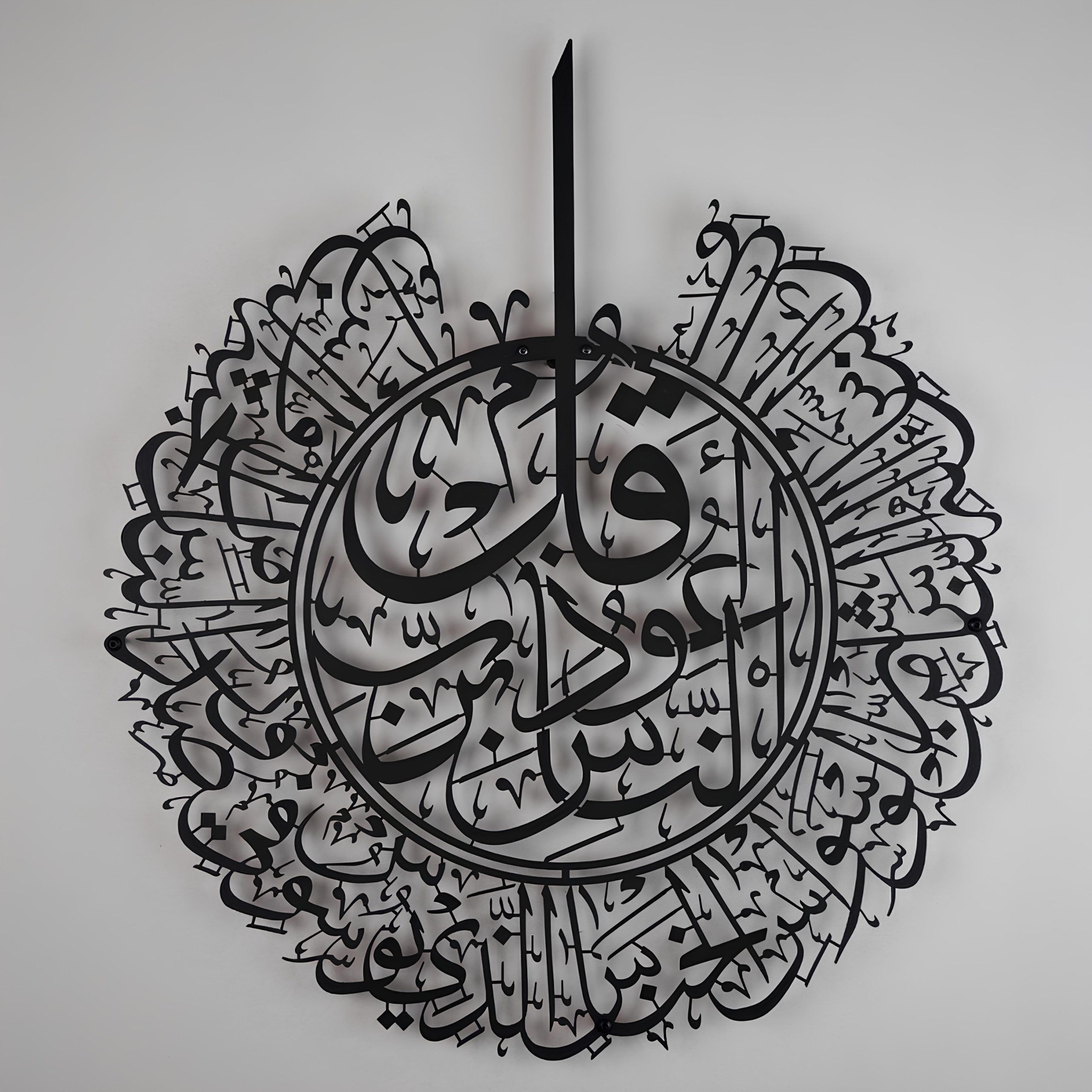 | This wall sculpture features the beautiful and powerful Surah Al-Nas in metal and beautiful Arabic calligraphy. The metal material means that you do not have to worry about it breaking either. Our standard Metal frame is the same price as the small frames from most other sellers. We have the best price for our pieces. Our pieces are 31″ L x 27.5″ W! We also offer them in 3 different colors: Black, Gold and Silver. Get our Islamic Wall art for your home today! |